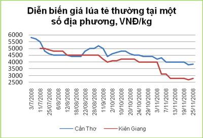 Đối với lượng lúa cũ từ vụ hè thu và thu đông, giá chỉ khoảng 2.800 đồng/kg, do chất lượng tiếp tục giảm trong quá trình bảo quản, thấp hơn 400-600 đồng/kg so với lúa đông xuân sớm mới thu hoạch. Với lượng lúa cũ này, hiện tại, Đồng Tháp còn tồn khoảng 200.000 tấn, Hậu Giang còn khoảng 80.000 tấn lúa.