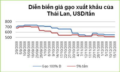 Giá gạo xuất khẩu Thái Lan ổn định trong tuần, gạo 100%B ở mức 550 USD/tấn, gạo 5% tấm ở mức 515USD/tấn. Năm 2009, Thái Lan sẽ tiếp tục thực hiện chương trình hỗ trợ giá gạo trong nước với kế hoạch chi tiết được thông qua vào tháng 1/2009. Hiện tại chính phủ Thái Lan đã thu mua được 1,3 triệu tấn thóc theo chương trình hỗ trợ giá vụ mới bắt đầu từ tháng 11/2008.