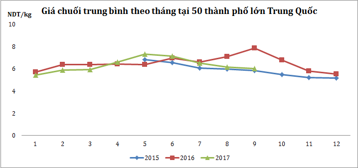 Giá chuối trung bình tại 50 thành phố lớn của Trung Quốc trong 9 tháng đầu năm 2017 của Trung Quốc giảm 5% so với cùng kỳ năm 2016.