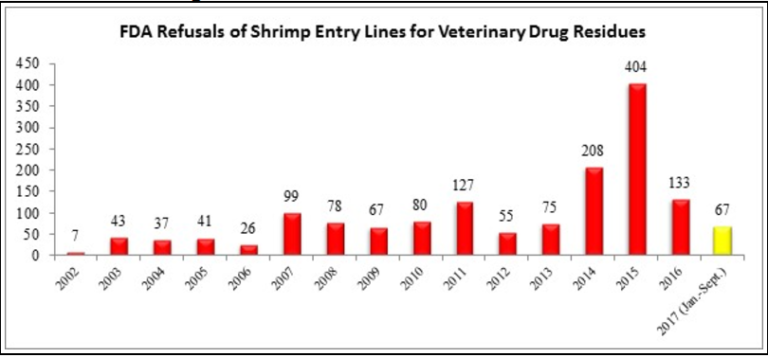 Trong 3 quý đầu năm 2017, FDA cho biết đã từ chối 67 lô hàng tôm do các lý do liên quan đến kháng sinh, thấp hơn nhiều so với số lô hàng bị từ chối trong năm 2014, 2015 và 2016.