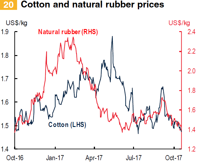 Giảm giá cao su tự nhiên phản ánh nguồn cung tăng trên khắp Đông Á, đặc biệt là tại Malaysia, nơi sản lượng cao su tự nhiên đã tăng hơn 20% trong nửa đầu năm 2017. Sản xuất cao su tự nhiên cũng tăng mạnh tại Thái Lan, chủ yếu nhờ điều kiện thời tiết thuận lợi. Giá cao su tự nhiên được dự báo tăng 28% trong năm 2017, bất chấp diễn biến giảm giá gần đây. Tuy nhiên, dù vẫn được dự báo tiếp tục tăng, mức tăng giá cao su tự nhiên trong năm 2018 và 2019 sẽ nhỏ.