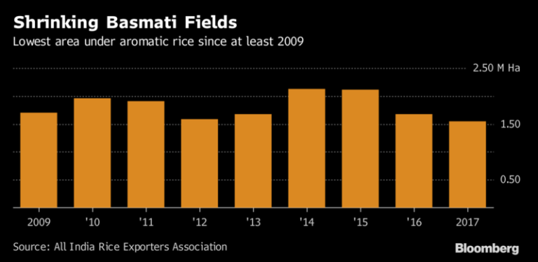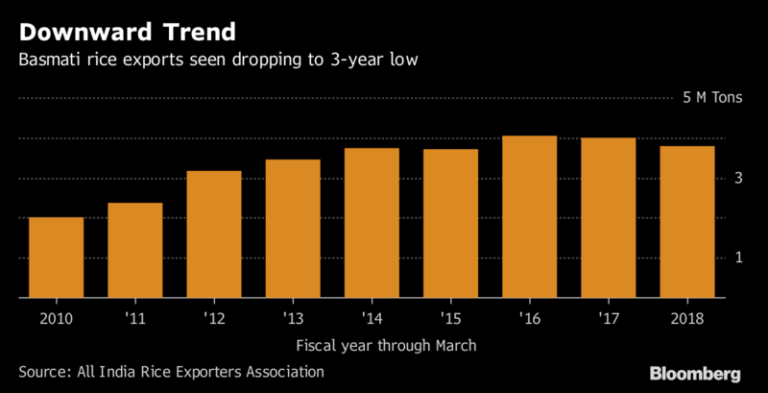Theo nhận định của ông Vijay Setia, chủ tịch Hiệp hội Các nhà xuất khẩu gạo toàn Ấn Độ (AIREA), xuất khẩu gạo basmati có thể giảm 5% xuống 3,79 triệu tấn trong năm tài khóa 2017 – 18, bắt đầu từ ngày 1/4 vừa qua. Đây sẽ mức xuất khẩu thấp nhất kể từ năm tài khóa 2014-15, theo dữ liệu của AIREA.
