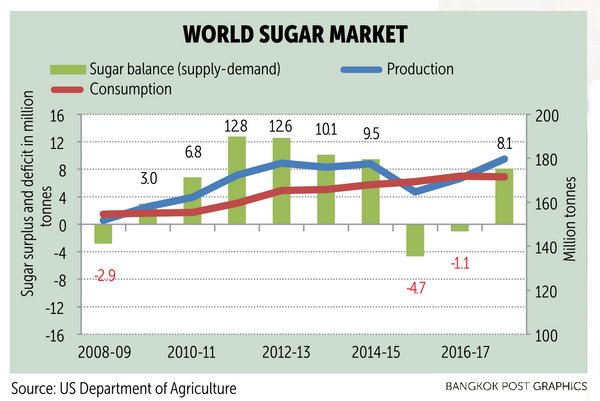 Nguồn cung từ Thái Lan tăng sẽ làm trầm trọng thêm áp lực lên giá đường khi nguồn cung đường toàn cầu được dự báo vượt nhu cầu. Tổ chức Đường Quốc tế (ISO) dự báo thặng dư đường toàn cầu niên vụ 2017/18 là 4,6 triệu tấn, so với mức thâm hụt 3,9 triệu tấn trong niên vụ trước.