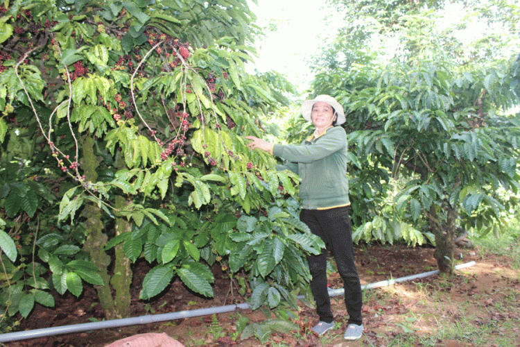 Nhờ tham gia mô hình sản xuất cà phê bền vững, vườn cà phê nhà chị Phất năm nay cho năng suất 4,5 tấn nhân/ha. |