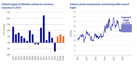 Sau khi suy yếu mạnh trong năm 2016, các nhà sản xuất cá hồi lớn trên thế giới là Na Uy và Chile phục hồi mạnh trong năm 2017, mặc dù mức tăng trưởng này sẽ không duy trì sang năm 2018, Rabobank nhận định.