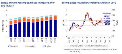 Tăng trưởng nguồn cung năm 2017 tương xứng với tăng trưởng nhu cầu, dẫn tới giá tôm năm 2017 ổn định và chỉ cao hơn một chút so với mức giá tôm trung bình dài hạn. Diễn biến này xảy ra vào thời điểm hàng loạt các sản phẩm thịt và thủy sản cao cấp đạt hoặc gần đạt mức giá cao kỷ lục. “Chúng tôi tin rằng diễn biến này sẽ khích lệ nhu cầu tôm, và với mức giá hiện tại, chúng tôi dự báo nhu cầu đối với tôm trong năm 2018 sẽ ở mức cao. Nếu dự báo nguồn cung tăng trở thành hiện thực, ngành tôm năm 2018 sẽ có một năm thuận lợi, với giá cao và biến động giá không quá mạnh”.
