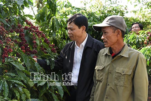 Bộ trưởng Bộ Nông nghiệp và PTNT Nguyễn Xuân Cường (bên trái) thăm vườn cà phê tham gia chương trình Nescafe Plan của ông Nguyễn Đăng Tỉnh ở thị trấn Nam Ban, Lâm Hà (Lâm Đồng). |