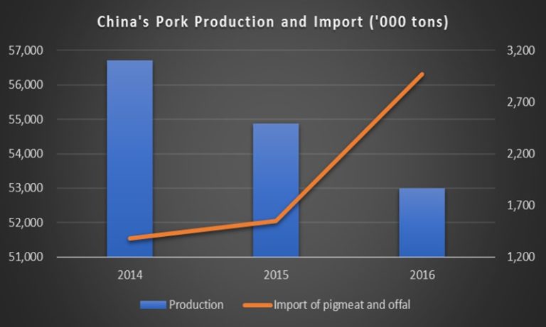 Sản xuất thịt lợn Trung Quốc tiếp tục suy giảm, từ 56,71 triệu tấn năm 2014 xuống còn 52,99 triệu tấn năm 2016, với tốc độ tăng trưởng kép -3%/năm; trong cùng kỳ, nhập khẩu thịt lợn và nội tạng lợn tăng mạnh, với tốc độ tăng trưởng kép 47%/năm. Năm 2016, Trung Quốc nhập khẩu 2,97 triệu tấn thịt lợn và nội tạng, tăng 91% so với năm 2015; khi đây cũng là năm bản lề triển khai các quy định môi trường mới.