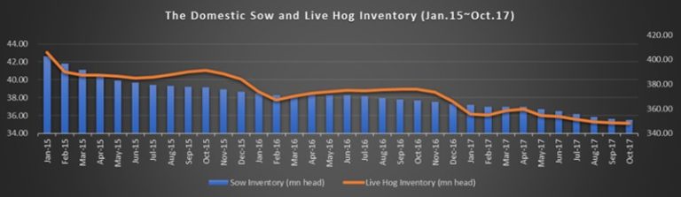 Bị tác động bởi các chính sách bảo vệ môi trường mới trong 3 năm qua, nhiều trang trại chăn nuôi lợn quy mô nhỏ và vừa của Trung Quốc đã bị xóa sổ. Hai hệ quả chính của diễn biến này là: một mặt, do các trại nuôi này tập trung tiêu thụ lợn, tổng sản lượng giết mổ của các nhà máy giết mổ tại Trung Quốc trong 10 tháng đầu năm 2017 đã đạt 178,5 triệu con, tăng 7% so với cùng kỳ năm 2016; mặt khác, như biểu đồ dưới đây cho thấy, kho lợn nái và lợn sống nội địa chạm mức thấp kỷ lục kể từ tháng 1/2015.