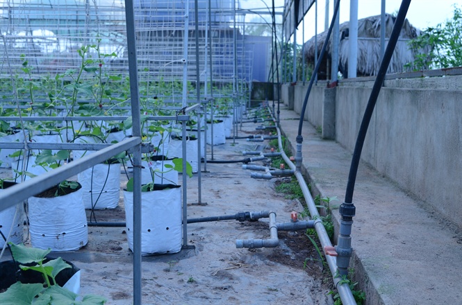 Địa điểm SX của công ty là khu đất rộng 1,4ha, nằm ngay cạnh sông Châu Giang. Ở đó, giám đốc Việt cho dựng mấy khu nhà lưới, bên trong anh trồng dưa chuột, cà chua Nhật trong bầu. Việc tưới nước hoàn toàn tự động bằng hệ thống ống tưới nhỏ giọt đã qua xử lý từ nguồn nước sông. Hơn 1ha nhưng chỉ có rất ít lao động, được Việt thuê người địa phương...