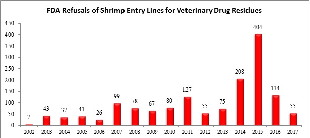 Một lần nữa trong năm 2017, báo cáo của FDA chỉ ra rằng vấn đề kháng sinh cấm trong tôm tiếp tục tập trung tại một số ít quốc gia, Đặc biệt 85,5% (47/55 lô hàng tôm) của tổng số các lô hàng tôm bị từ chối do kháng sinh cấm trong năm 2017 đến từ chỉ 3 quốc gia: 19 lô hàng tôm bị từ chối trong năm 2017 đến từ Trung Quốc (bao gồm cả Hong Kong), 16 lô hàng đến từ Việt Nam và 12 lô hàng đến từ Ấn Độ.