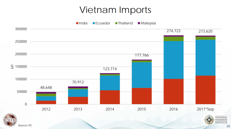 Diễn biến này dẫn đến giá tôm tại Việt Nam cao hơn các nước khác tại châu Á do các nhà máy phải cạnh tranh mạnh nguồn tôm nguyên liệu với thương nhân Trung Quốc. Việt Nam cũng hưởng lợi từ việc thắt chặt kiểm soát các lô hàng tôm từ Ấn Độ do kháng sinh trên thị trường EU, và Thái Lan bị mất lợi thế cạnh tranh trên thị trường châu Âu nhờ thuế. Biên giới với Trung Quốc tại miền Bắc Việt Nam được xem là một tuyến đường buôn lậu chính các sản phẩm tôm và thủy sản khác sang Trung Quốc. Ngoài ra, các thành viên phiên thảo luận cũng nhấn mạnh thực trạng các nhà đóng gói tôm Việt Nam đang nhập khẩu tôm để gia công chế biến. Tuy nhiên, các diễn biến này đều tiềm ẩn nhiều bất ổn, đặc biệt là khi chính phủ Trung Quốc triển khai các đợt triệt phá buôn lậu từ cuối năm 2017.