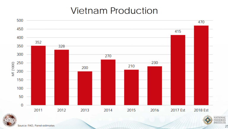 Năm 2016, sản xuất tôm tại Việt Nam chỉ đạt 230.000 tấn do dịch bệnh và hạn hán, theo thông tin trong phiên thảo luận. Năm 2017, sản lượng tôm Việt Nam ước đạt 415.000 tấn và dự báo sẽ tăng lên 470.000 tấn trong năm 2018.