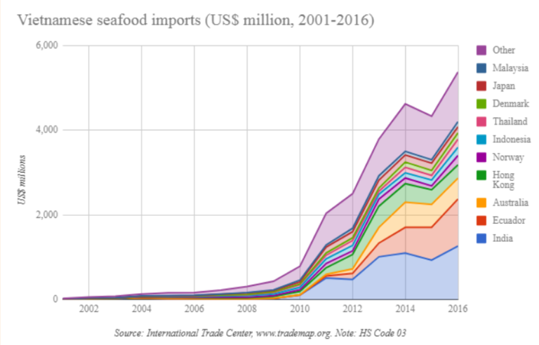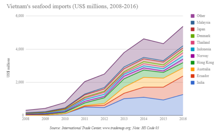 Hiệp hội các nhà sản xuất – xuất khẩu thủy sản Việt Nam (VASEP) không phản hồi trước yêu cầu bình luận về chủ đề này, nhưng dữ liệu hải quan Việt Nam ghi nhận con số nhập khẩu thủy sản thấp hơn nhiều – khoảng 1 tỷ USD trong năm 2016 – so với số liệu mà ông Nikolik thu thập. Dữ liệu thương mại trong báo cáo này được cung cấp bởi các cơ quan hải quan của các nước xuất khẩu, không từ Hải quan Việt Nam.