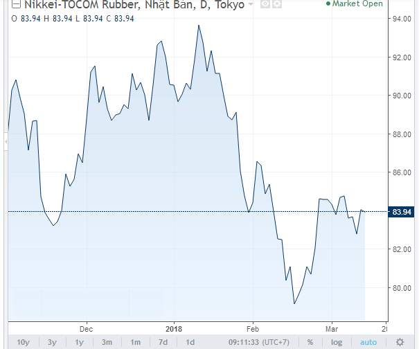Tại sàn giao dịch hàng hóa Tokyo (TOCOM), giá cao su giao kỳ hạn tháng 8 tăng 0,3 yên lên 193 yên (tương đương 1,82 USD/kg). Giá cao su tại Thượng Hải kết thúc phiên giao dịch đêm tăng 0,3%.