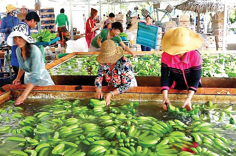 Sơ chế chuối già cấy mô xuất khẩu ở Nông trường Sông Hậu. Ảnh: Băng Thạch. |