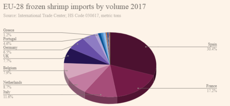 Với lượng tôm khả dụng xuất khẩu tăng, người tiêu dùng Mỹ và EU tích cực thưởng thức bữa tối ở ngoài, xuất khẩu tôm toàn cầu tăng vọt. Theo ITC, 28 nước thành viên EU đã nhập khẩu tổng cộng 540.724 tấn tôm trong năm 2017, tăng 6,4% so với năm 2016. Tây Ban Nha vẫn là nước nhập khẩu tôm lớn nhất EU, theo sau là Pháp và Ý.