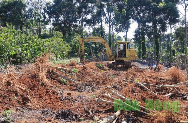 Người dân xã Đức Minh (Đắk Mil) nhổ bỏ gốc cà phê già cỗi, cải tạo đất để chuẩn bị tái canh trong mùa mưa sắp tới |