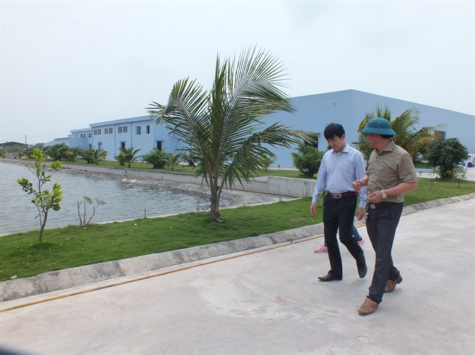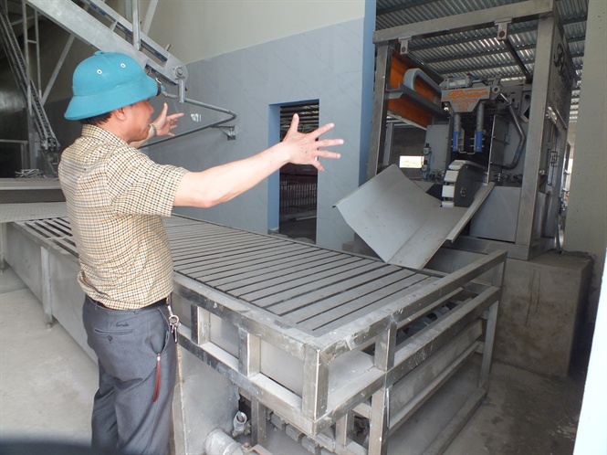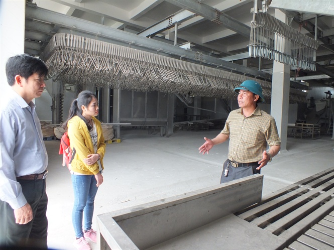 Ông Vũ Trọng Nghĩa (đội mũ), GĐ Công ty Biển Đông giới thiệu dây chuyền giết mổ - chế biến thịt lợn hàng trăm tỉ đồng nhưng chưa biết bao giờ có thể hoạt động |