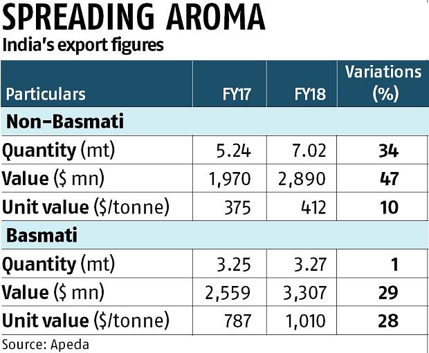 Dữ liệu từ Cơ quan Phát triển Xuất khẩu Nông sản và Thực phẩm chế biến (APEDA) cho thấy xuất khẩu gạo non-basmati trong 10 tháng đầu năm tài khóa 2017/18 đạt 7,01 triệu tấn, trị giá 2,89 tỷ USD, so với 5,25 triệu tấn, trị giá 1,97 tỷ USD trong cùng kỳ năm tài khóa 2016/17.