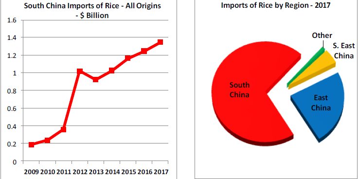 Mặc dù Trung Quốc là nước sản xuất gạo lớn nhất thế giới, nước này cũng là nước nhập khẩu gạo lớn nhất thế giới, chiếm hơn 10% thương mại gạo toàn cầu. Việt Nam là nước cung cấp gạo lớn nhất của miền Nam Trung Quốc, chiếm khoảng một nửa tổng nhập khẩu gạo của khu vực này, theo sau là Thái Lan và Campuchia.