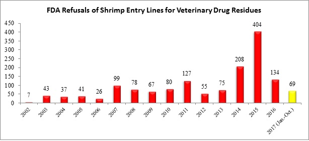 SSA nhấn mạnh rằng theo dữ liệu các lô hàng tôm bị từ chối từ FDA cho thấy trong 16 năm qua từ 2002 – 2017, Trung Quốc chiếm hơn 42% tổng số lô hàng thủy sản nhập khẩu bị từ chối do phát hiện tấy dư lượng thuốc thú y. Tỷ lệ này tăng mạnh trong thời gian gần đây. Năm 2017, thủy sản Trung Quốc chiếm 57% tổng số lô hàng bị FDA từ chối do liên quan đến kháng sinh. Và trong 4 tháng đầu năm 2018, tỷ lệ này lên tới hơn 91%.