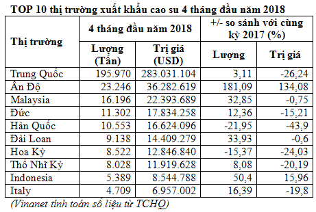 Mặc dù giảm trong tháng 4/2018, nhưng nếu tính chung 4 tháng đầu năm 2018 thì lượng cao su xuất khẩu sang các thị trường chủ lực vẫn duy trì tốc độ tăng trưởng. Cụ thể, xuất sang thị trường Trung Quốc, tăng 3,2% về lượng, nhưng giảm 26,1% về trị giá so với cùng kỳ 2017, đạt 195,97 nghìn tấn, 283 triệu USD. Trung Quốc là thị trường chiếm tỷ trọng lớn lượng cao su xuất khẩu chiếm 59%, nhưng giảm so với tỷ trọng 63,1% của 4 tháng năm 2017.