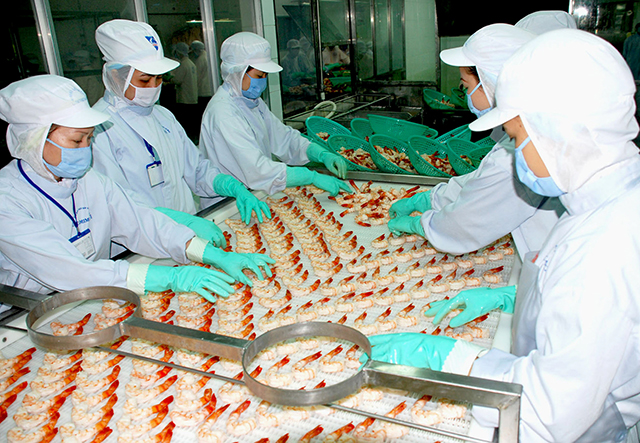 Chế biến tôm xuất khẩu ở Công ty CP chế biến thủy sản xuất nhập khẩu Cà Mau . (Ảnh: Lê Huy Hải/TTXVN). |