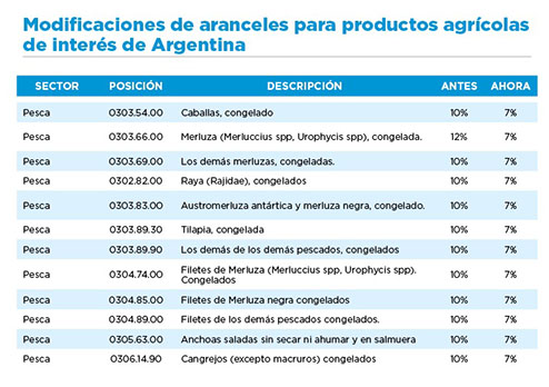Các chính sách thuế mới diễn ra trong khuôn khổ các cuộc đàm phán của Argentina với Trung Quốc, do Hội đồng Các thị trường công nông nghiệp Argentina và Bộ Nông nghiệp Trung Quốc, thông qua Đại sứ quán Argentina tại Trung Quốc. Liên quan đến các sản phẩm thủy sản, Trung Quốc đã giảm thuế từ 10% xuống 7% cho: cá hake nguyên con, đông lạnh và phile; cá rô phi và cá đuối đông lạnh; cá cơm tẩm muối và cua đông lạnh.