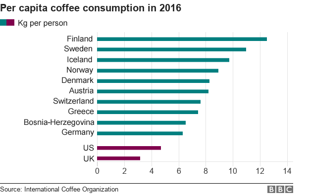 Về tiêu dùng cà phê, hiện chỉ có hai nước tiêu dùng hơn 10kg/người/năm là Phần Lan và Thụy Điển, theo thống kê của Tổ chức Cà phê Quốc tế. Người Phần Lan đã luôn đứng đầu bảng xếp hạng này, với mức 12,5 kg/người/năm. Các nước vùng Bắc Âu chiếm toàn bộ top 5, có thể là bởi họ luôn cần cà phê cho những ngày giá rét.