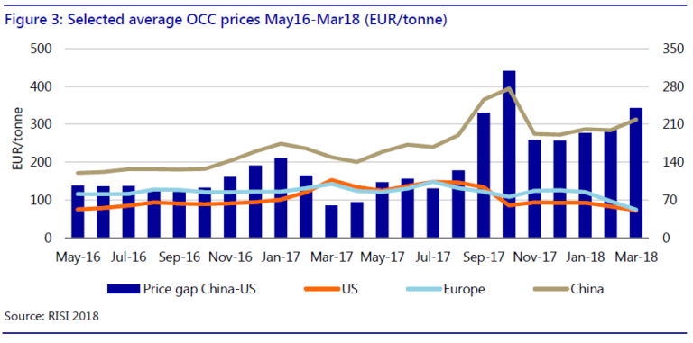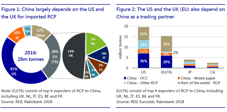 Vào cuối năm 2017, Trung Quốc áp lệnh cấm hoàn toàn nhóm hàng giấy RCP tạp dùng để sản xuất giấy carton làm thùng đựng hàng, dẫn đến nhập khẩu RCP giảm tới 20%, tương đương 4,9 triệu tấn. Tháng 1/2018, Trung Quốc áp dụng thêm các hạn chế nhập khẩu thông qua tiêu chuẩn nhiễm bẩn tối đa mới cho RCP ở mức 0,5%, so với mức 1,5% trước đây. Một chính sách khác mà Trung Quốc cũng áp dụng là hạn ngạch nhập khẩu. Từ năm 2015 – 2017, hạn ngạch nhập khẩu RCP đã giảm đi gần một nửa do tác động của nhiều chính sách khác nhau. Ngoài ra, nước này cũng triển khai nhiều hạn chế theo thời điểm và khó đoán. Ví dụ như Trung Quốc vừa thông báo việc kiểm tra 100% các lô hàng OCC/RCP từ Mỹ, có hiệu lực từ ngày 4/5 – 4/6/2018, khiến nhiều lô hàng từ Mỹ bị từ chối.