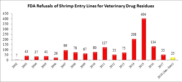 Cơ quan Quản lý Thuốc và Thực phẩm Mỹ (FDA) vừa công bố thông tin liên quan đến các lô hàng nhập khẩu bị từ chối trong tháng 6/2018, cho thấy 5/118 (4,2%) lô hàng thủy sản bị từ chối trong tháng vừa qua là các lô hàng tôm liên quan đến các loại kháng sinh cấm. Trong nửa đầu năm 2018, FDA đã từ chối tổng cộng 25 lô hàng tôm do liên quan đến dư lượng thuốc thú y cấm.