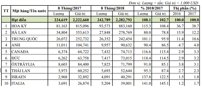 8 tháng đầu năm 2018, các thị trường có giá trị xuất khẩu hạt điều tăng mạnh là Italia tăng 45,1% và Israen 22,5% so với cùng kỳ năm trước.