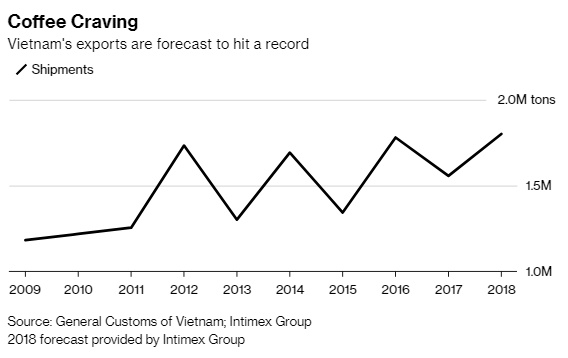 Sản lượng của việt Nam trong giai đoạn 2018-2019 – tính từ tháng trước – có thể tăng hơn 2% lên 1,83 triệu tấn với giả định thời tiết bình thường, dựa trên ước tính trung bình của 14 trader tham gia cuộc thăm dò của Bloomberg. Con số này cao hơn so với 1,82 triệu tấn từ cuộc khảo sát trước đó và 1,8 triệu tấn từ Intimex và Simexco Dak Lak, nhà xuất khẩu cà phê lớn thứ hai Việt Nam. Hồi tháng 7/2018, Bộ Nông nghiệp Việt Nam cho biết sản lượng sẽ vượt ngưỡng 1,8 triệu tấn.