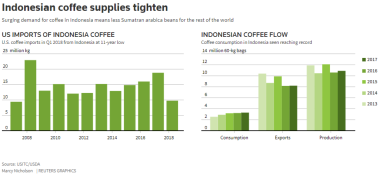 Các nhà rang xay lớn Starbucks và Keurig Green Mountain là những người mua lớn nhất nguồn cung cà phê Arabica Sumatra, theo các nhà nhập khẩu cho biét, và các công ty nhỏ hơn có vẻ sẽ gặp khó khăn trong thu mua loại cà phê này. Một người phát ngôn của Starbucks cho biết công ty vẫn chưa bị ảnh hưởng bởi tình trạng nguồn cung cà phê Sumatra khan hiếm trong năm 2018. Keurig không phản ứng trước các yêu cầu bình luận.