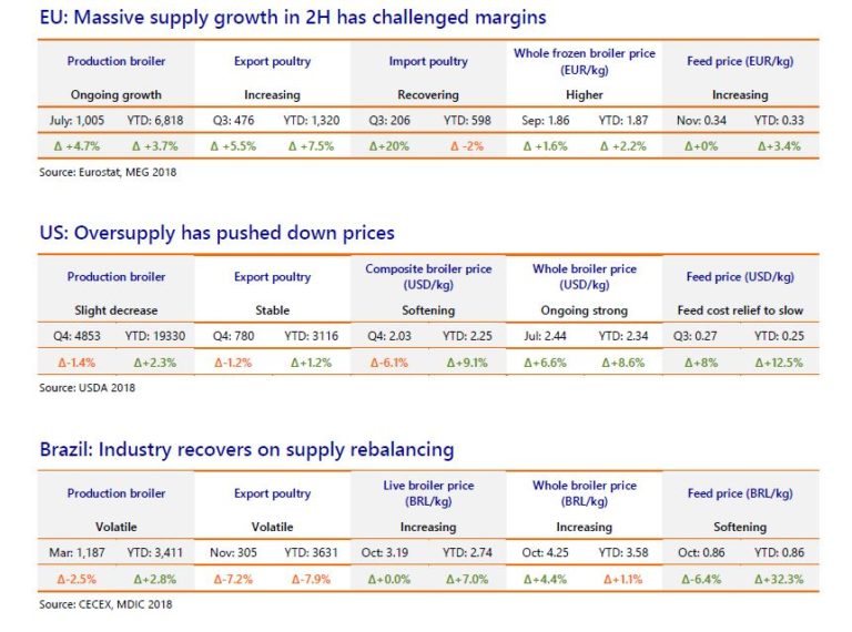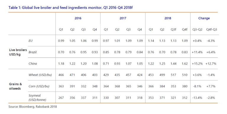 Rabobank nhận định thị trường thịt gia cầm thế giới sẽ tiếp tục biến động mạnh trong nửa đầu năm 2019, với các yếu tố như nguồn cung protein động vật khác tăng lên – ví dụ sản xuất thịt lợn và thịt bò Mỹ, sẽ có thẻ gây ra tình trạng dư cung thịt – gây áp lực lên giá và các luồng thương mại toàn cầu trong những tháng tới.