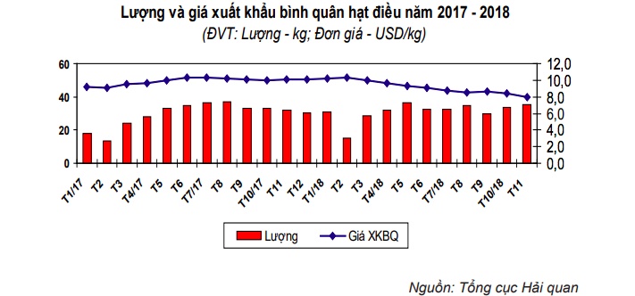 Theo Tổng cục Hải quan, lũy kế đến ngày 15/12, xuất khẩu hạt điều nhân đạt 355.600 tấn, trị giá 3,22 tỉ USD, tăng 5,4% về lượng nhưng giảm 4,1% về trị giá so với cùng kì năm ngoái. Giá điều xuất khẩu bình quân đạt 9.061 USD/tấn, giảm 9% so với cùng kì năm 2017.