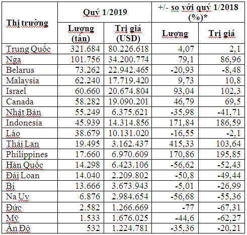 Trung Quốc dẫn đầu thị trường cung cấp phân bón cho Việt Nam trong quý đầu năm nay, chiếm 32,69% tổng lượng phân bón nhập khẩu, đạt 321,6 nghìn tấn, trị giá 80,22 triệu USD, tăng 4,07% về lượng và 2,1% trị giá so với cùng kỳ. Giá nhập bình quân 249,4 USD/tấn, giảm 1,9%. Tính riêng tháng 3/2019, Việt Nam cũng đã nhập khẩu phân bón từ thị trường này 153,5 nghìn tấn, trị giá 35,96 triệu USD, tăng gấp 2,5 lần về lượng và gấp 2,4 lần về trị giá so với tháng 2/2019, nếu so với tháng 3/2018 thì tăng 5,21% về lượng nhưng giảm 3,78% về trị giá.