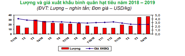4 tháng đầu năm 2019, giá xuất khẩu bình quân hạt tiêu đạt mức 2.621 USD/tấn, giảm 25,9% so với cùng kỳ năm ngoái.