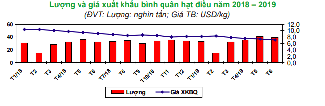 Theo số liệu của Cục Xuất nhập khẩu tháng 6, giá điều nhân xuất khẩu bình quân đạt mức thấp 7.024 USD/tấn, giảm hơn 4% so với tháng 5/2019.