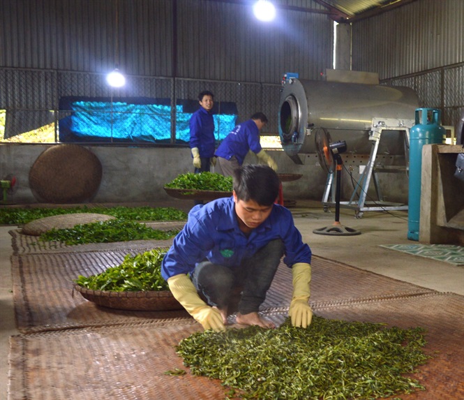 Công nhân HTX Sơn Trà sơ chế chè Shan tuyết |