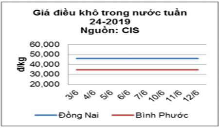 Tại thị trường nội địa, cùng với xu hướng giá thế giới giá điều nhân tính đến tuần giữa tháng 6/2019 giá tiếp tục ổn định tại Đồng Nai và Bình Phước. Cụ thể, điều khô mua xô tại Bình Phước ở mức 34.500 đ/kg; tại Đồng Nai ổn định ở mức 46.000 đồng/kg so với đầu tháng 6/2019.