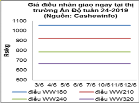 Giá hạt điều tại thị trường Delhi, Ấn Độ, điều nhân xu hướng ổn định trong tháng 6/2019. Cụ thể, tại phiên giao dịch tuần đến 15/6, giá điều nhân WW180 ở mức 1055 Rs/kg; điều nhân loại WW210 ở mức 925 Rs/kg; điều nhân loại WW240 ở mức 785 Rs/kg; điều nhân loại WW320 ở mức 665 Rs/kg giá ổn định so với đầu tháng 6/2019.