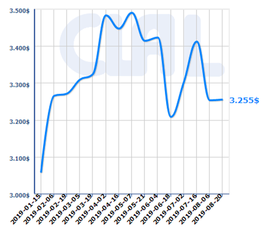 Như vậy giá sữa bình quân trong tháng 8/2019 giảm 1,6% so với tháng 7/2019 xuống còn ở mức 3.254 USD/tấn.