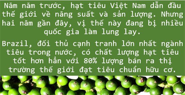 Năm năm trước, hạt tiêu Việt Nam dẫn đầu thế giới về năng suất và sản lượng. Nhưng hai năm gần đây, vị thế này đang có nguy cơ bị nhiều quốc gia như Brazil, Ấn Độ, Indonesia làm lung lay. Brazil, đối thủ cạnh tranh lớn nhất ngành tiêu trong nước, có chất lượng hạt tiêu tốt hơn hẳn với 80% lượng bán ra thị trường thế giới đạt tiêu chuẩn hữu cơ.