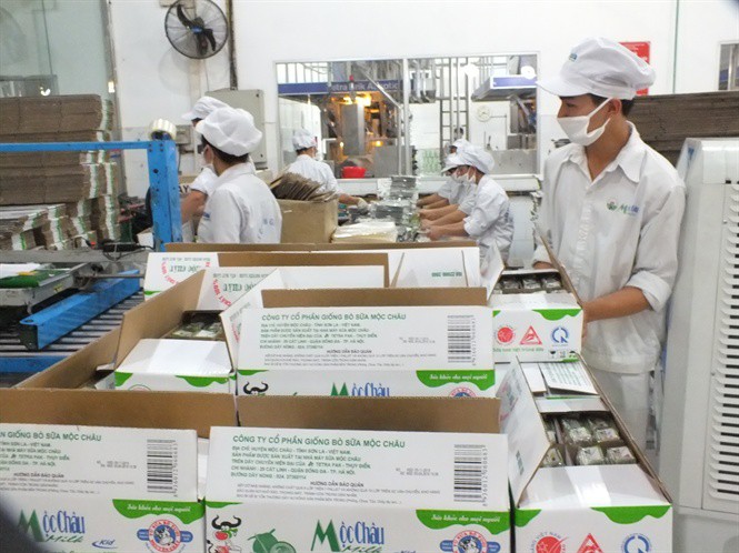 Dây chuyền đóng hộp của Mộc Châu Milk. Ảnh: Đinh Tùng. |