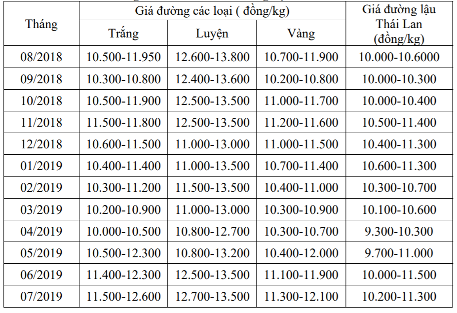 Trên thị trường thế giới, niên vụ 2018/2019 đã xuất hiện giá đáy mức 10 Uscent/lb vào thời điểm tháng 9/2018. Cho đến nay giá đường vẫn ở mức thấp và dao động quanh mức 12 Uscent/lb. Như vậy, sau khi đạt đỉnh mức 23 Uscent/lb vào tháng 8/2016, giá đường đã liên tục giảm và mức giá hiện nay thấp hơn giá thành sản xuất của bất kì quốc gia nào.