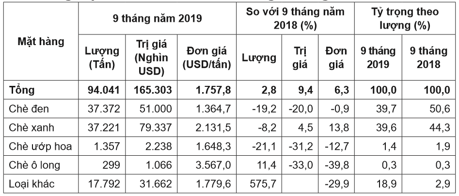 Cơ cấu chủng loại chè xuất khẩu của Việt Nam trong năm 2019 có nhiều biến động. Theo tính toán từ số liệu thống kê của Tổng cục Hải quan, tỉ trọng xuất khẩu chè đen và chè xanh trong tổng lượng chè xuất khẩu giảm so với cùng kì.