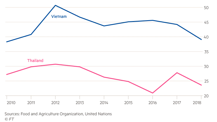 So sánh giá mía có thể thấy ngành đường Việt Nam không thể cạnh tranh được với Thái Lan. Đơn vị: USD/tấn. Nguồn: Financial Times. |