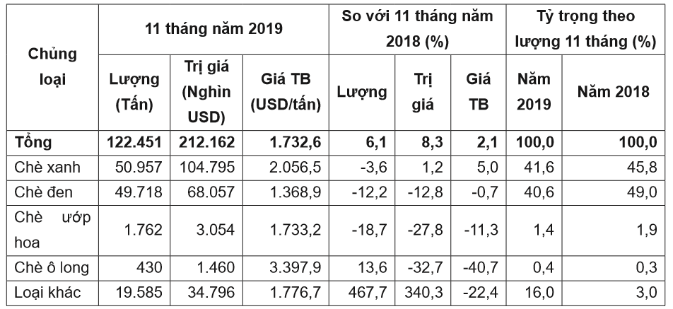 Với mặt hàng chè đen, khối lượng xuất khẩu trong 11 tháng đầu năm 2019 đạt 49.700 tấn, trị giá đạt 68 triệu USD, giảm 12,2% về lượng và giảm 12,8% về kim ngạch so với cùng kì năm trước.